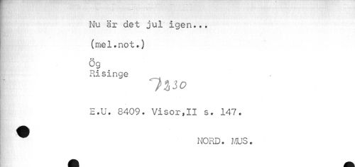 //// ¦ //// Nu är det jul igen... //// (mel.not.) ** //// o 9 //// Risinge //// E.U. 8409. Visor,II s. 147. //// M hk //// NORD. MUS. ////