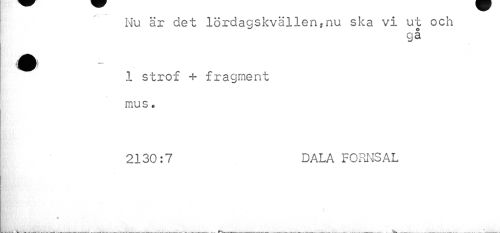 //// Nu är det lördagskvällen,nu ska vi ut och //// gå //// ^^ 1 strof + fragment //// mus. //// 2130:7 DALA FORNSAL //// \ //// « ////