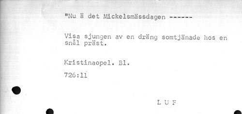 //// "Nu ä det Mickelsmässdagen---- //// Visa sjungen av en dräng somtjänade hos en snål präst. //// Kristinaopel. Bl. 726:11 //// L U F ////