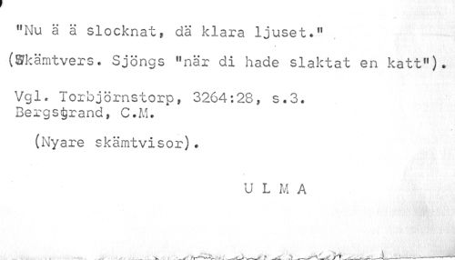 //// "Nu ä ä slocknatf dä klara ljuset." (ffkämtvers. Sjöngs "när di hade slaktat en katt"). //// Vgl. Torbjörnstorp, 3264:28, s«3. Bergstrand, C.M. //// (Nyare skämtvisor)? //// U L M A //// . X-____ * . ' . 1.___^ ////