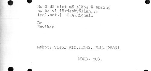 //// Nu ä dä slut mä släpa å spring nu ha vi lördaskvällen..? (mel.not.) K.A.Rignell //// Dr //// Enviken //// Mskpt• Visor VII.s.243. E.U. 28891 //// NORD. MUS. ////