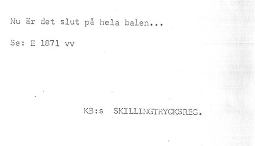 //// Nu är det slut på hela balen... Se: E 1871 vv //// é //// » //// v //// //// /KB:s SKILLINGTRYCKSREG. //// # //// 1 ////