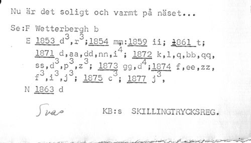 //// • I //// Nu är det soligt och varmt på näset... //// Se:F Wetterbergh b //// E 1853 d3,r3ilS54 mgi:1859 ii; 1861 t; //// 4 //// 1871 d,aa,dd,nn,i ; 1872 k,l,q,bb,qq, ss»d3sp3,z3; 1873 qo;,d4; 1874 f,ee,zz, f3,i3J3i 1875 c3; 1877 j3, //// N 1863 d //// Wmmmmmammmmmm> //// ) KB:s sKlLLINGTRYCKSREG. //// \ jr. - ////