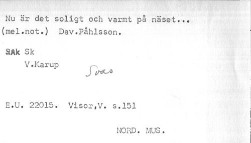 //// Nu är det soligt och varmt på näset... (mel.not.) Dav.Påhlsson. //// SÅk Sk //// V.Karup //// j //// i //// E.U. 22015. Visor,V. s.151 //// : //// NORD. MUS. i //// i ////