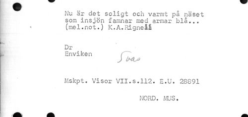 //// Nu är det soligt och varmt på näset som insjön famnar med armar blå... //// • (mel * not*) K.A.Rigneåå //// ¦ //// MW/. y //// Dr //// Enviken //// /J lu W //// Mskpt. Visor VII.s.112. E.U. 28891 //// NORD. MUS. ////