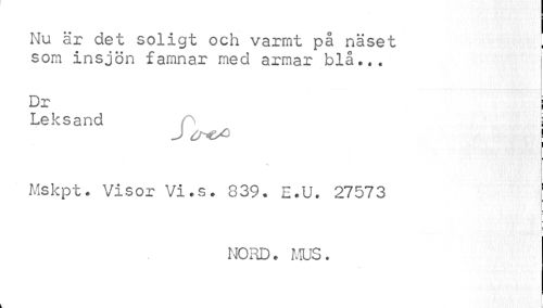 //// Nu är det soligt och varmt på näset som insjön famnar med armar blå... //// Dr i //// Leksand j //// ^ , i //// i //// Mskpt. Visor Vi.s. 839. E.U. 27573 1 //// - //// L //// nord . mus. ////