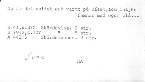 //// Nu är det soligt och varmt på näset,som insjön //// famnar med ögon blå.,. //// B 41,s.372 Skördevisa. 9 str. B 79:2,s.107 11 5 str. //// A 441:6 Skördemannen. 2 str. //// I //// I //// J u-&-/0 //// RA ////
