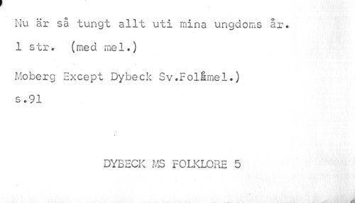 //// Nu är så tungt allt uti mina ungdoms år* 1 str. (med mel.) //// Moberg Except Dybeck Sv.Folåmel.) s .91 //// DYBECK MS FOLKLORE 5 //// A ////