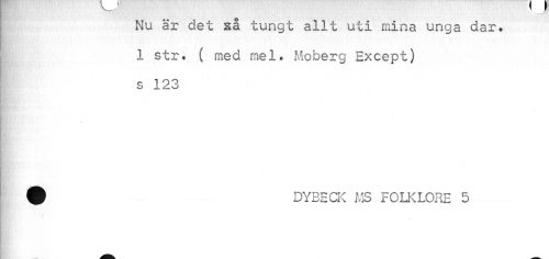 //// Nu ar det så tungt allt uti mina unga dar. //// v //// 1 str. ( med mel. Moberg Except) s 123 //// W DYBECK MS FOLKLORE 5 //// .v' * ////