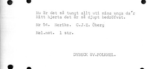 //// Nu är det så tungt allt uti mina unga da'r Mitt hjerta det är så djupt bedröfvat. //// i • Nr 54. Nerike. C.J.E. Öberg //// Mel.not. 1 str. //// DYBECK SV.FOLKMEL. ////