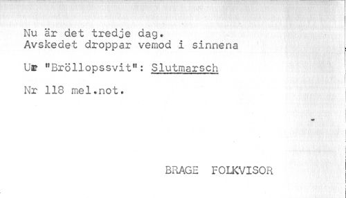//// 4 //// Nu är det tredje dag. Avskedet droppar vemod i sinnena //// Uc "Bröllopssvit": Slutmarsch //// Nr 118 mel•not. //// i //// BRAGE FOLKVISOR //// i ////