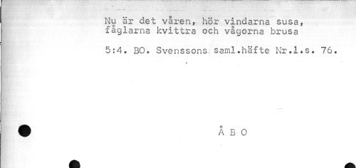 //// V" - - //// Nu är det våren, hör vindarna susa, fåglarna kvittra och vågorna brusa //// 5:4. BO. Svenssons saml.häfte Nr.!*s. 76. ////