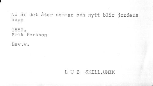 //// Nu är det åter sommar och nytt blir jordens hopp I //// 1885 J: //// Erik Persson Bev.v. //// L U B SKILL.UNIK ////