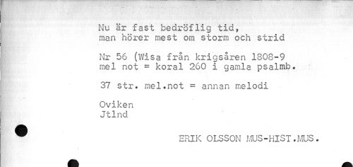 //// i //// ¦ //// ¦ //// Nu är fast bedröflig tid, //// man hörer mest om storm och strid //// » //// Nr 56 (Wisa från krigsåren 1308-9 mel not = koral 260 i gamla psalmb. : //// 37 str* mel.not = annan melodi //// Oviken Jtlnd //// ® ERIK OLSSON MUS-HIST.MUS. //// \ ////