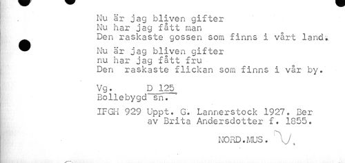 //// Nu är jag bliven gifter Nu har jag fått man //// Den raskaste gossen som finns i vårt land. //// ^ Nu är jag bliven gifter //// nu har jag fått fru //// Den raskaste flickan som finns i vår by. //// Vg * D 125 //// Bo lie bygd sn.~ //// IFGH 929 Uppt. G. Lannerstock 1927. Ber //// av Brita Andersdotter f. 1855. //// NORD.MUS. ////