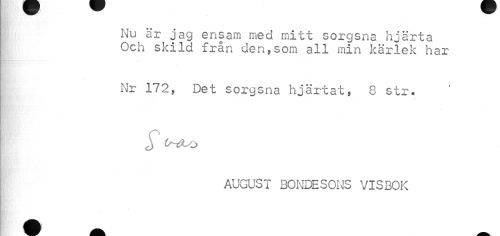 //// DHjn/v» • - //// Nu är jag ensam med mitt sorgsna hjärta Och skild från den,som all min kärlek har //// Nr 172, Det sorgsna hjärtat, 8 str. //// //// /AUGUST BONDESONS VISBOK //// B ////