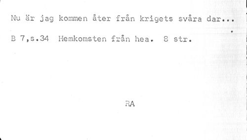 //// 1 //// Nu är jag kommen åter från krigets svåra dar... i //// # //// B 7,s.34 Hemkomsten från hea. 8 str. I //// i //// i i //// i i //// RA ////