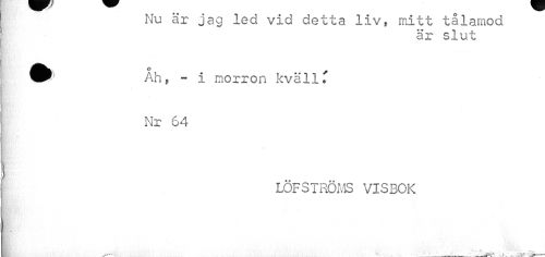//// Nu är jag led vid detta liv, mitt tålamod //// är slut //// •i ° * //// p Ah, - i morron kväll. //// Nr 64 //// i //// LÖFSTRÖMS VISBOK //// ,-----• ¦ ' V . Ä-> » "A* ' ////