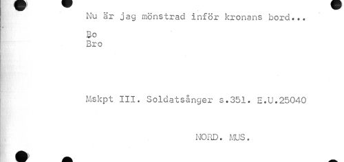 //// Nu är jag mönstrad inför kronans bord... //// Rpv //// Bo Bro //// Mskpt III. Soldatsånger s.351. E.U.25040 //// NORD. MUS. //// •V ////