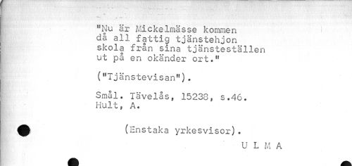 //// "Nu ar Mickelmässe kommen då all fattig tjänstehjon skola från sina tjänsteställen ut på en okänder ort." //// ("Tjänstevisan"). //// | Smål« Tävelås, 15233, s.46. //// Hult, A. //// ^ (Enstaka yrkesvisor). //// U L M A ////