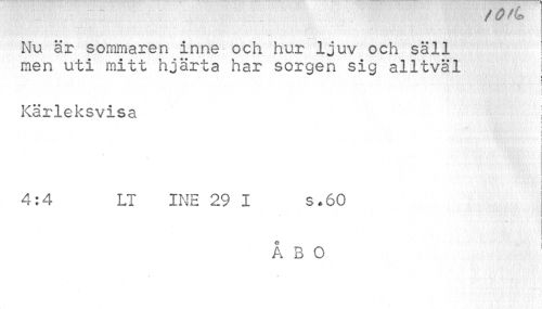 //// ( i/ ris* //// Nu är sommaren inne och hur ljuv och säll //// men uti mitt hjärta har sorgen sig alltväl [ //// j //// Kärleksvisa I //// i //// i i //// i i //// i //// i //// 4:4 LT INE 29 I s.60 //// i i //// ÅBO 1 //// r. ////