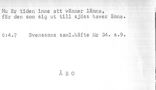//// Nu är tiden inne att vänner lämna, //// för den som sig ut till sjöss haver ämna* //// 6:4.? Svenssons saml.häfte Nr 34. s.9. //// ÅBO //// ta ////