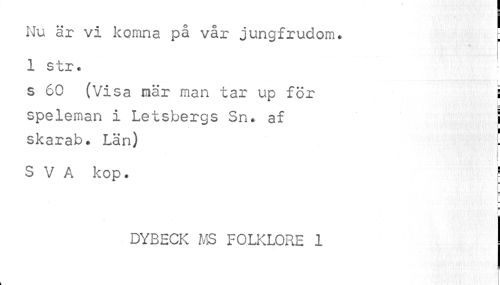 //// Nu är vi komna på vår jungfrudom. 1 str. //// s 60 (Visa mär man tar up för i //// speleman i Letsbergs Sn. af j //// skarab. Län) \ //// i //// 5 : //// S V A kop. 5 //// t //// s //// I //// DYBECK MS FOLKLORE 1 ////