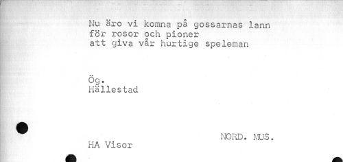 //// Nu äro vi komna på gossarnas lann //// för rosor och pioner //// att giva vår hurtige speleman //// Og. //// Hällestad //// ® NORD« MUS. //// HA Visor ////