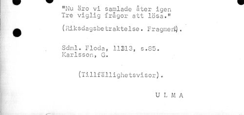 //// f,Nu äro vi samlade åter igen Tre viglig frågor att lösa.11 //// q (Riksdagsbetraktelse. Fragmert). //// Sdml. Flöda, 11313, s.85. Karlsson, G. //// (Tillfällighetsvisor). //// U L M A ////