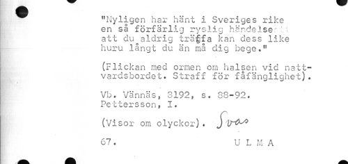 //// "Nyligen har hänt i Sveriges rike en så förfärlig ryslig händelse't-t att du aldrig träffa kan dess like huru långt du än må dig bege." //// (Flickan med ormen om halsen vid nattvardsbordet. Straff för fåfänglighet). //// v //// Vb* Vännäs, 3192, s. 38-92. Petterssonf I* //// (Visor om olyckor). //// 67. U L M A ////