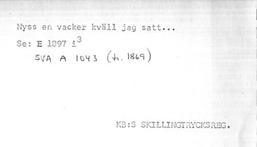 //// Nyss en vacker kväll jag satt... //// Se: E 1097 i3 //// StfA A 104 1 i . ^ ) //// A'- ¦" ¦ ¦ .V'/ "i //// r //// i //// ¦ //// . t» //// I //// '' i //// KB:S SKlLLINGTRYCKSREG. ////