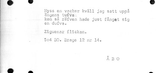 //// Nyss en vacker kväll jag satt uppå ängens tufvaa //// kom så räfven hade just fånget sig en dufva. //// Ziguenär flickan. 5:4 BO. Brage 12 nr 14. //// ÅBO //// Hl — ////