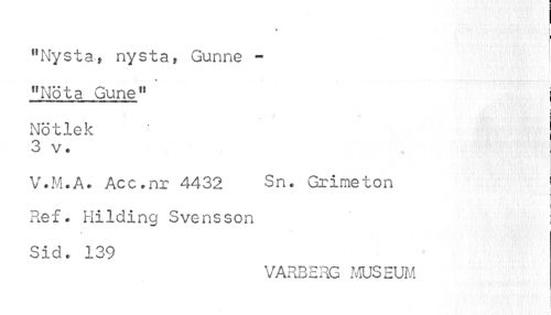 //// I //// "Nysta, nysta, Gunne - //// "Nöta Gune" ' i //// i //// Nötlek 3 v. //// V.M.A. Acc.nr 4432 Sn. Grimeton //// Ref. Hilding Svensson ; //// Sid. 139 //// VARBERG MUSEUM //// - ////