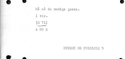 //// Nå nå du modige gosse. //// 1 str. //// ' « //// (D 71) //// s 80 B //// DYBECK MS FOLKLORE 5 ////
