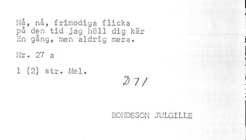 //// . i "( / _ y •; ^ (V v (i 7 • v iljJ' l^öi»^^ bmaäKI //// i //// Nå, nå, frimodiga flicka på den tid jag höll dig kär //// En gång, men aldrig mera. j //// u //// Nr. 27 a I //// 1 (2) str. Mel. //// 2)7/ ! //// ¦ //// i //// BONDESON JULGILLE //// I ////