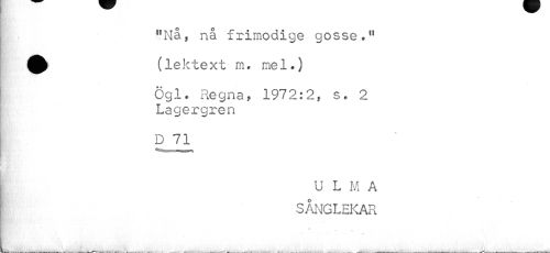 //// "Na, nå frimodige gosse." //// ^ (lektext m. mel.) //// Ögl. Regna, 1972:2, s. 2 Lagergren //// 2-Ti //// U L M A SÅNGLEKAR //// "f* "T //// » ? r ////