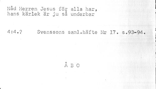 //// Nåd Herren Jesus för alla har, hans kärlek är ju så underbar //// ; //// 4:4.? Svenssons saml.häfte Nr 17. s.93-94. ! //// i //// I //// i //// f //// ÅBO //// I ////