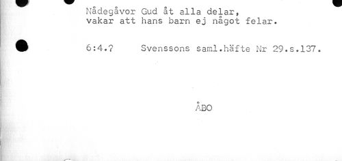 //// Nådegåvor Gud at alla delar, vakar att hans barn ej något felar. //// £ 6:4.? Svenssons saml.häfte Nr 29.s.137. //// ÅBO ////