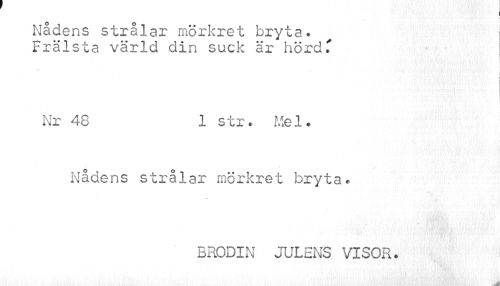 //// I //// I. //// Nådens strålar mörkret bryta. Frälsta värld din suck är hörd T //// i //// Nr 48 1 str. Mel. //// » //// Nådens strålar mörkret bryta• //// BRODIN JULENS VISOR. //// Jå ////