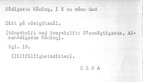//// Nådigaste Kåning* I ä nu wånn Gud //// ¦ //// ¦ //// i ? //// Dikt på västgötamål. //// (böneskrift med överskrift: Stormägtigastet Al-ranådigaste Kåning). //// Vgl. 19. //// (Tillfällighetsdikter). : //// "i //// U L M A ////
