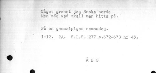 //// wsffsnrv.¦<¦;/• " »• ¦• - . - ¦ ----- //// : //// Något grannt jag önska borde Men säg vad skall man hitta på. //// ¦ //// På en gammalpigas namnsdag. //// 1:12. PA. S.L.S. 277 s.672-673 nr 45. //// a b o //// ¦ ////