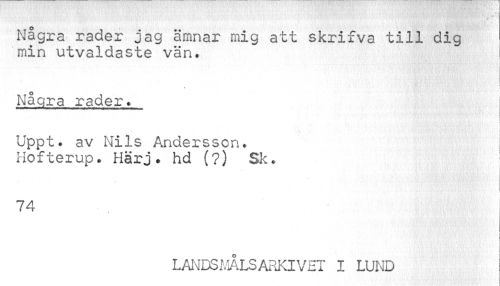 //// Några rader jag ämnar mig att skrifva till dig //// min utvaldaste vän. //// » //// Några rader. //// Uppt. av Nils Andersson. Hofterup. Härj. hd (?) Sk. //// i i //// 74 //// LANDSMÅLSARKIVET I LUND j ////