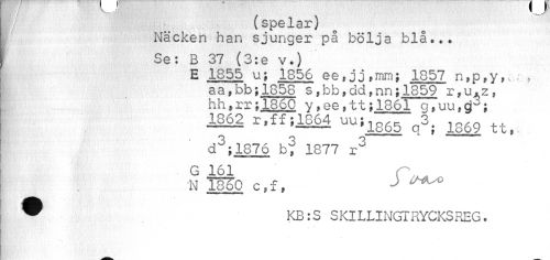 //// I .. , (spelar) //// Nacken han sjunger pa bölja blå... //// Se: B 37 (3:e v.) //// E 1855 u; 1856 ee»jjfmm; 1857 n,p,y,c„-. aa,bb;1858 s,bb,dd,nn;1859 r*u.zs //// hh,rr;1860 y,ee,tt?1861 //// d°;1876 bV 1877 r3 G 161 //// N 186Q c,f, ^^ ...... //// j^k Hk //// | KB:S SKlLLINGTRYCKSREG. //// ¦Bi" ii : //// _ ////