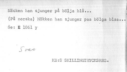 //// Näcken han sjunger på bölja blå... j //// (På norska) Nökken han sjunger paa bolga blaa... //// • 1 • . :;-•.•'• f 1 //// /Se: E 1861 y j //// 1 ¦ //// KB:S SKlLLINGTRYCKSREG. //// I ////