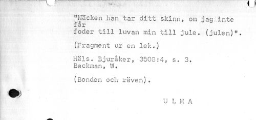 //// .. . - * ¦ ' ' V //// "Näcken .han tar ditt skinn, om jag:.inte får //// foder till luvan min till jule. (julen)11. //// - //// (Fragment ur en lek.) //// Häls• Bjuråker, 3503:4, s* 3. //// Backman, W. (Bonden och räven)* //// ' ' U L M A ////