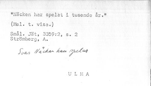 //// i //// "Näcken har spelat i tusende år*ft (Mel* t. visa.) //// w" //// Smål. Jat, 3359:2, s. 2 Strömberg, A. //// U L M A ////