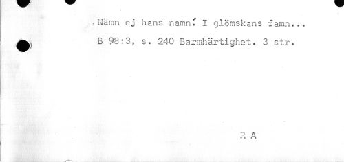 //// > //// ¦ Nämn ej hans namn T I glömskans famn... //// B 98:3, s. 240 Barmhärtighet. 3 str. //// » //// * //// R A ////