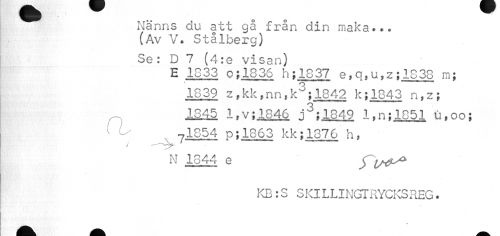 //// Nänns du att gå från din maka... (Av V. Stålberg) //// Se: D 7 (4:e visan) //// E 1033 o;1836 h;1837 e,g,u,z;1838 m; //// 1839 z,kk,nn,k3;1842 k; 1843 n,z; 1345 1,v; 1846 ,i3; 1849 l.n:l851 u»oo; ?1854 p;1863 kk;1876 h, //// N 1344 e / i/i^ //// KB:S SKILLINGTRYCKSREG. //// » ////