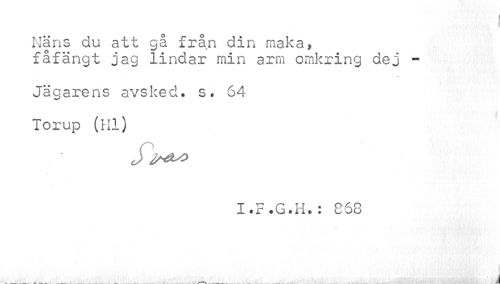 //// ! //// Näns du att gå från din maka, //// fåfängt jag lindar min arm omkring dej - //// Jägarens avsked, s. 64 //// Torup (Hl) //// J //// I.F.G.H.: 868 //// t //// _____ - . —___ ////