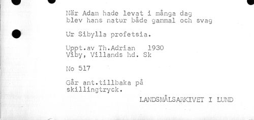 //// När Adam hade levat i många dag blev hans natur både gammal och svag //// ^ Ur Sibylla profetsia* //// Uppt.av Th.Adrian 1930 Vi by f Vi Hands hd. Sk //// No 517 //// Går ant.tillbaka på skillingtryck. //// LANDSMALSARKIVET I LUND //// M< -V- t Vi ////